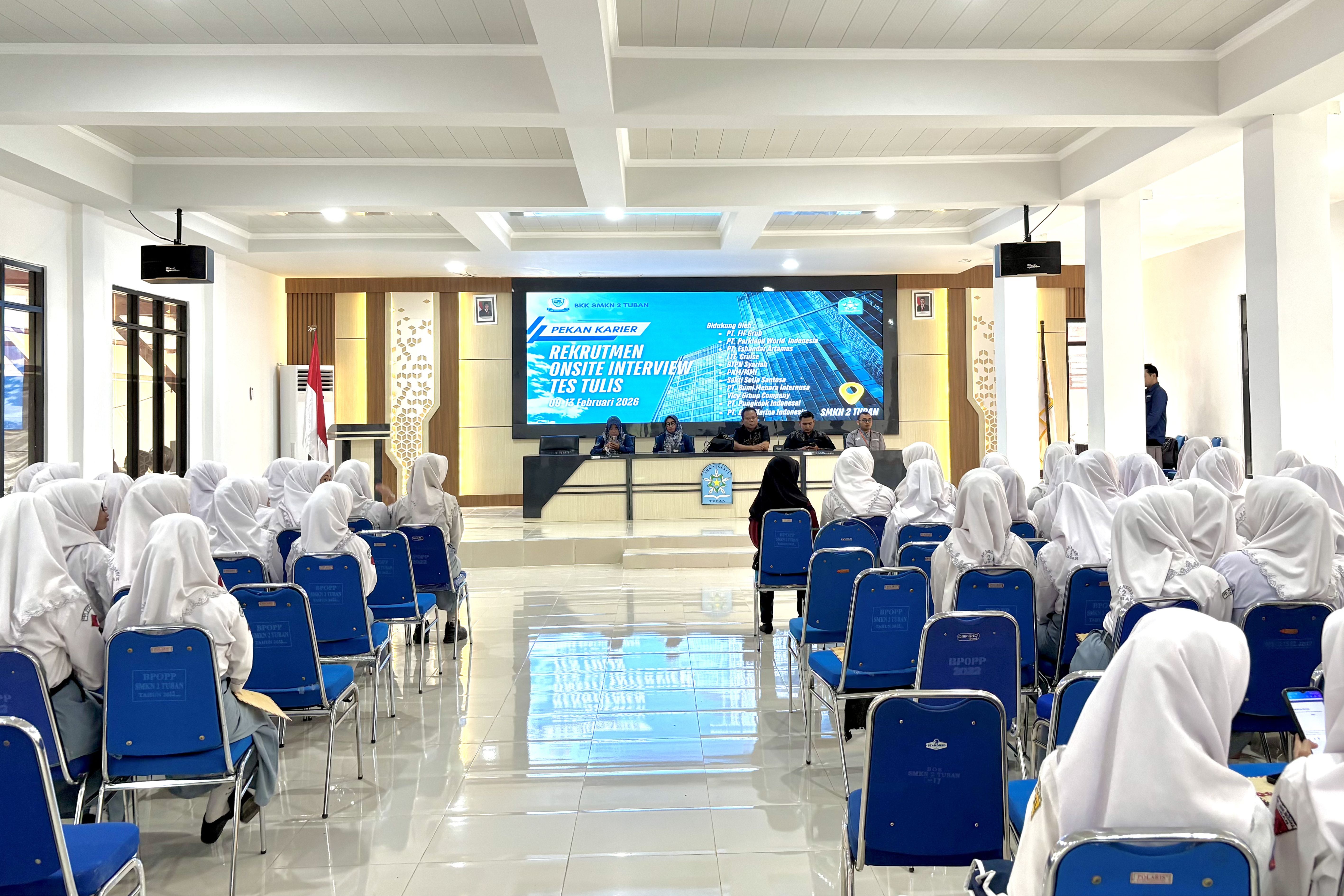 Atmosfer kompetisi dan harapan kembali terasa kuat di Aula SMK Negeri 2 Tuban pada Selasa, 10 Februari 2026. Memasuki hari kedua Pekan Karier, Tim Bursa Kerja Khusus (BKK) SMKN 2 Tuban menghadirkan tiga perusahaan dari sektor berbeda dalam satu panggung rekrutmen. Sejak pagi hari, para alumni dan siswa kelas XII, termasuk peserta dari sekolah lain, tampak antusias mengikuti rangkaian kegiatan yang membuka peluang kerja secara langsung.