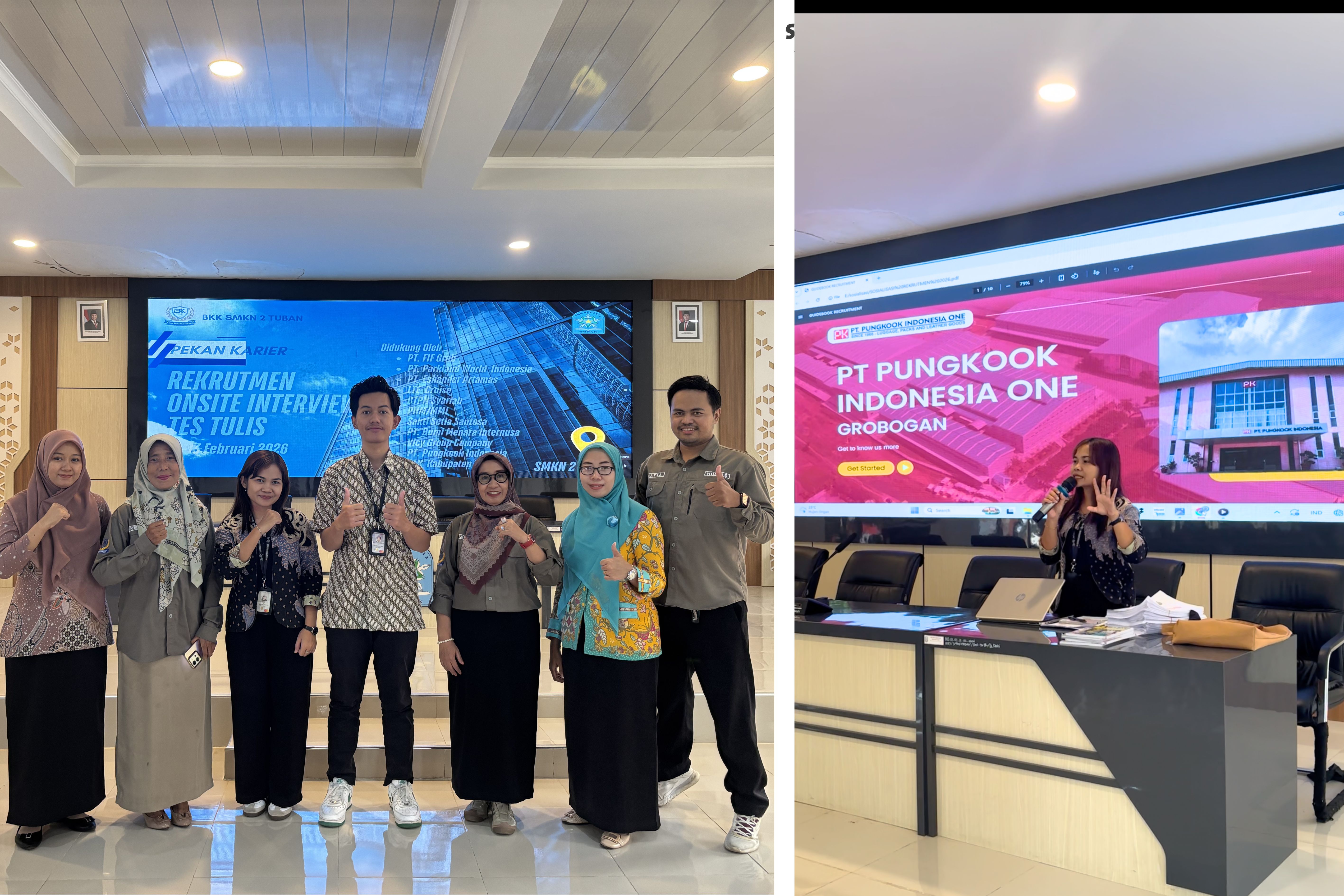 Pada hari terakhir ini, Tim Bursa Kerja Khusus (BKK) SMKN 2 Tuban menghadirkan proses rekrutmen dari PT Pungkook Indonesia One. Perwakilan perusahaan terlebih dahulu menyampaikan company profile yang memaparkan informasi mengenai bidang usaha, sistem kerja, serta peluang karier yang dapat diikuti oleh para pelamar.
